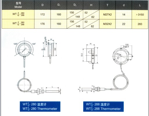 壓力式溫度計(jì) 一、用途及特點(diǎn) WTZ/WTQ-280/288系列壓力式溫度計(jì)該型號(hào)壓力式溫度計(jì)適用于過程中較遠(yuǎn)距離的非腐蝕性液體或氣體的測(cè)量,電接點(diǎn)型壓力式溫度計(jì)能在工作溫度達(dá)到和超過給定值