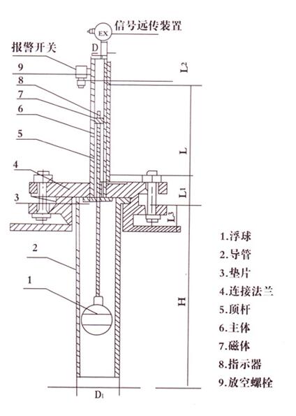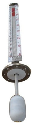 首先拆下導管下端的浮球托桿,將浮球連接頂端的磁阻件拆下,然后將浮球同連接桿一起裝入導管內(nèi),再講磁阻件裝上,導管下端的托桿也裝好并固定,二人托起導管垂直插入設備內(nèi)(注意加放密封墊)再在導管法蘭上放上密封墊后,將主體管翻板箱體組件垂直放上,安裝時一人看好磁阻件連接桿不能碰彎(連接桿玩彎曲將引起液位計呆滯甚至不能正常使用)使密封墊和導管法蘭進入主體管下端法蘭的凹面內(nèi),均勻擰緊法蘭螺釘,這樣液位計即可投入使用(翻板指示器下部的不動部分為測量死區(qū)。