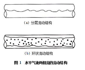 當流速特別高的時候,也會表現(xiàn)為環(huán)狀流動,即管壁上有液膜,管道中心部分為帶液滴的氣核,由于水平流動時重力的影響作用,下部液膜要比上部管壁的厚,如圖1b)所示。