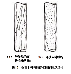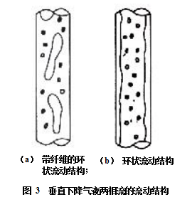 在垂直下降管道中,氣液兩相流動的結(jié)構(gòu)與作垂直上升流動時的結(jié)構(gòu)很相似,但有不同,不僅流動方向相反,而且在平均流速相同的情況下,垂直下降管道中液體的流速比垂直上升管道中液體的流速快得多。