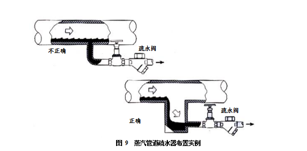疏水是否充分的標志是蒸汽管中是否排得出凝結(jié)水。如圖8所示的配置能從后一個疏水器中的排水量獲得判斷。后一個疏水器如果極少有水排出,則表明前一只疏水器已充分疏水。