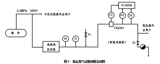 江蘇奧科儀表有限公司在為江蘇的一家藥業(yè)公司組建全廠蒸汽計量網(wǎng)的項目中,碰到了一個令人費解的故障,這個故障發(fā)生在一個蒸汽流量計測量過熱蒸汽流量的系統(tǒng)中,這個系統(tǒng)的管道連接如圖4所示。